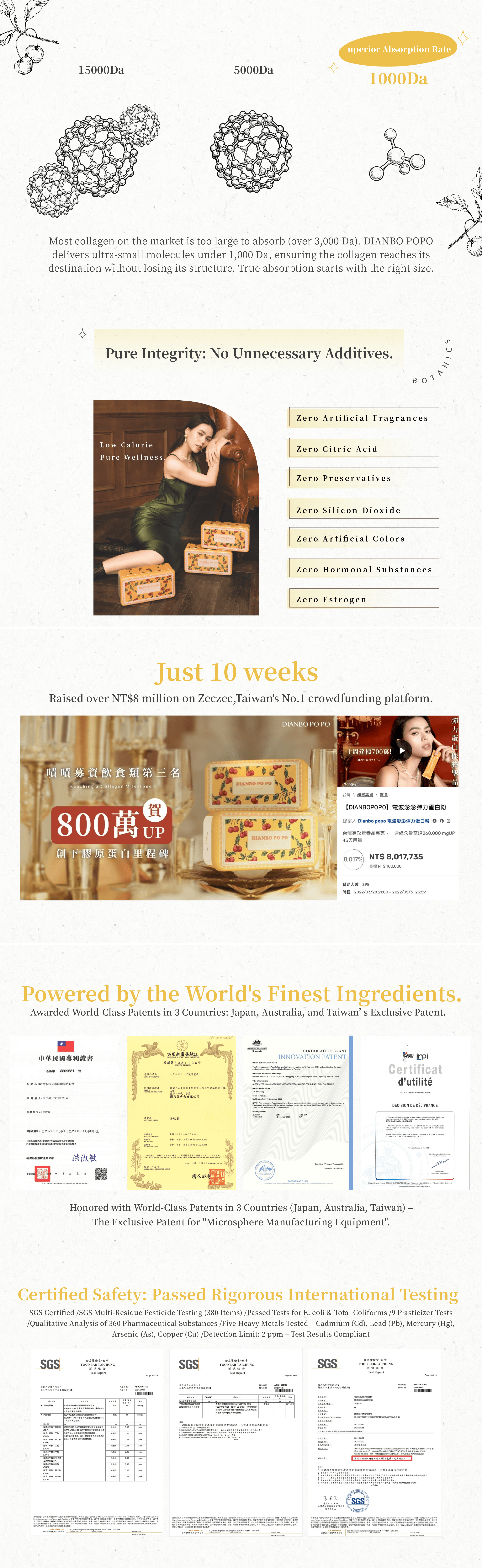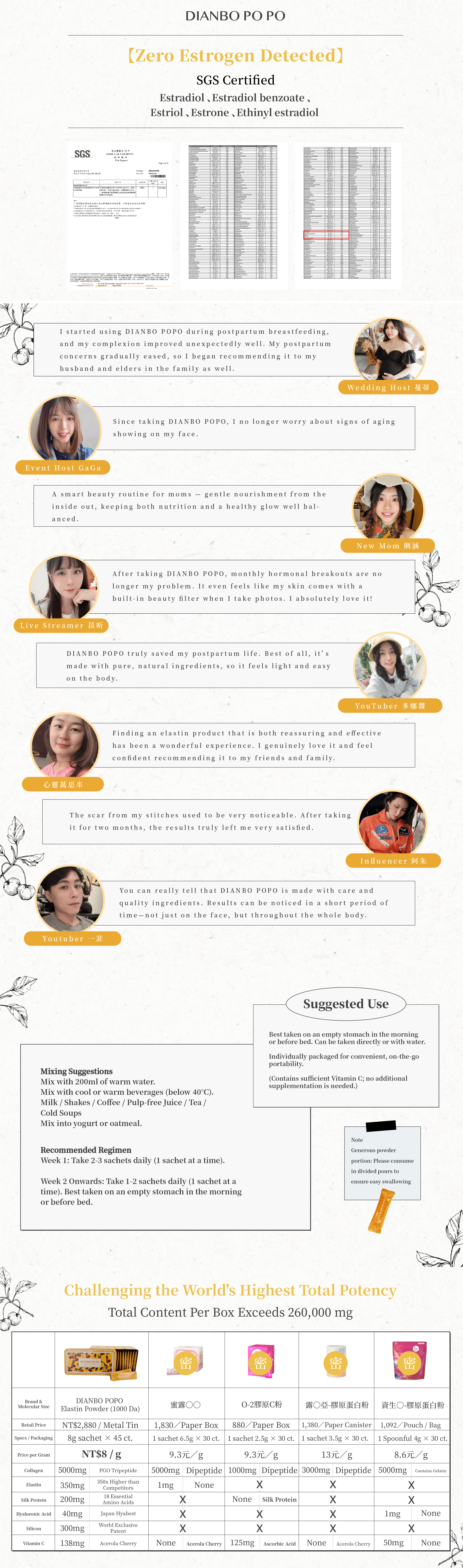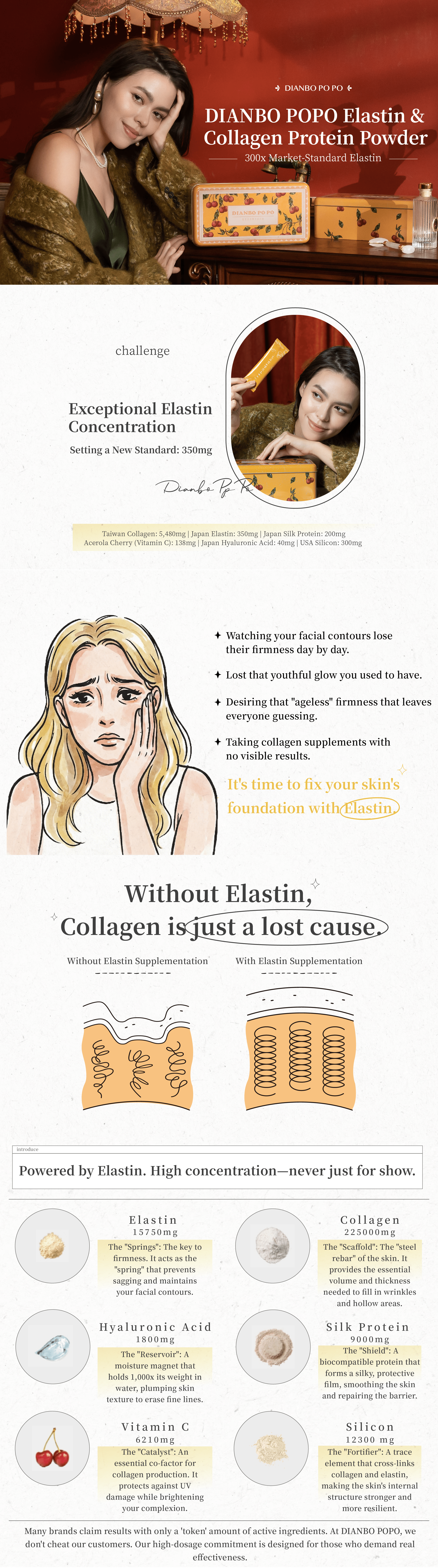Collagen means nothing without elastin. Enriched with 350mg of elastin and 6 premium luxury ingredients.